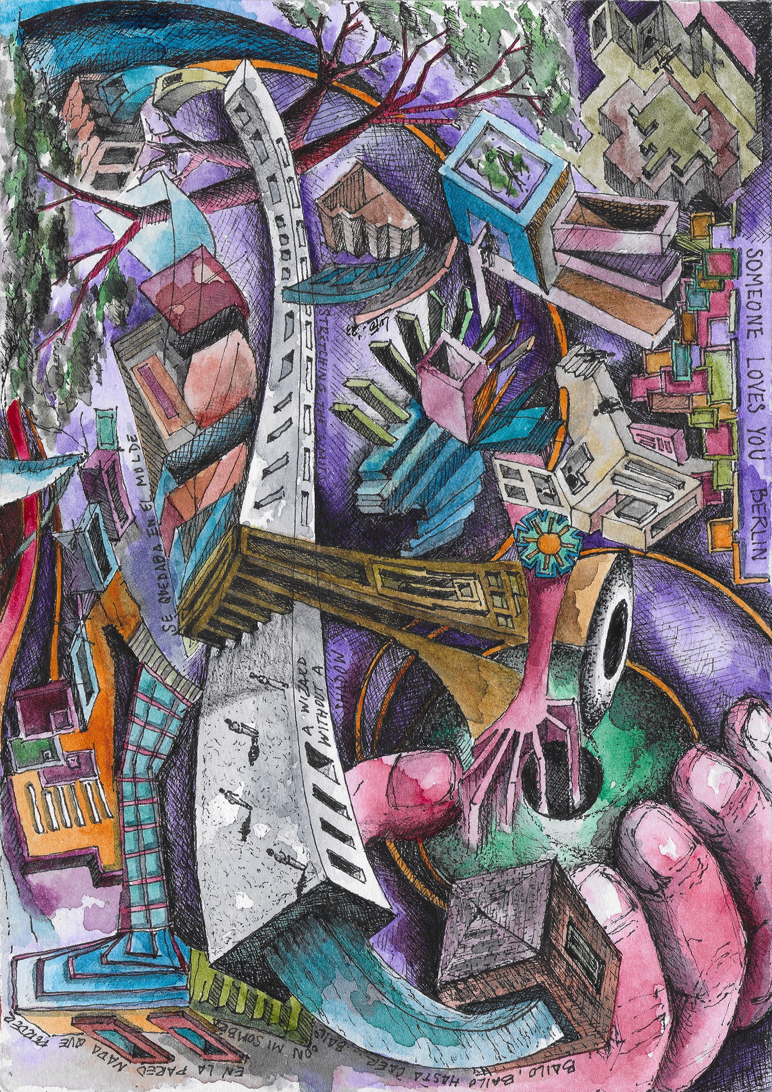 Running All Day emerged from a creative session on June 26, 2023, deeply influenced by the psychedelic rock album Space Rider by Nodarling. In fact, Quique del Bianco inspired me, a fellow artist at Mauerpark and the band’s guitarist and vocalist. I listened to the album during my breakfast at Unser Café and left the music’s energetic, space-travel vibe, to guide the drawing’s development. In the end, I got a three-vanishing points linear perspective with Escher-like optical paradoxes.