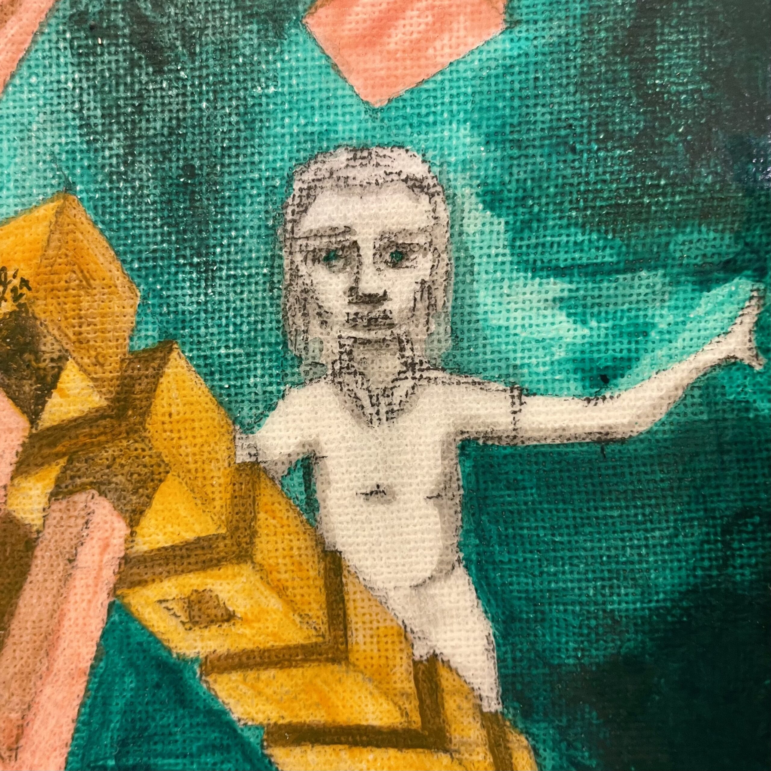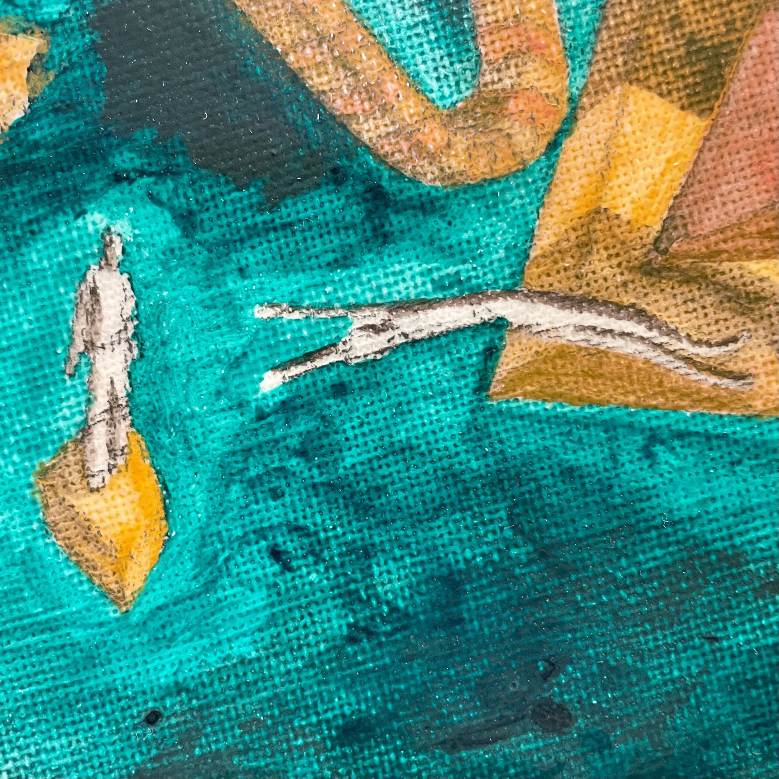 This artwork is actually one of the very first canvases that I painted with acrylics. Or, to be completely honest, the first one after so many years! The story goes that I used to paint with acrylics with my godmother, back in the 90’s when I used to spend my school holidays at her place. However, since I entered high school (a military aeronautical high school), I stopped painting and in many senses I stopped my artistic explorations. So, now that I’m closer to my 40’s than to my 20’s, I decided to try again the experience… And I must say, I am loving it.
